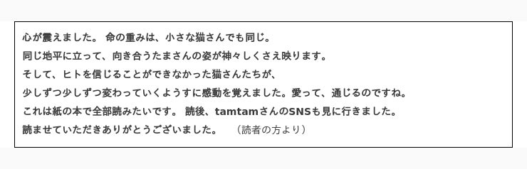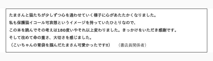 その後、第2弾の刊行を望む声や、インスタグラムに投稿された「ホゴネコ」とのエピソードの書籍化を望む声が多く寄せられ、今回の出版が決定しました。前作『たまさんちのホゴイヌ』および本作『たまさんちのホゴネコ』の著者印税にあたる全額は、動物福祉活動に充てられます。
