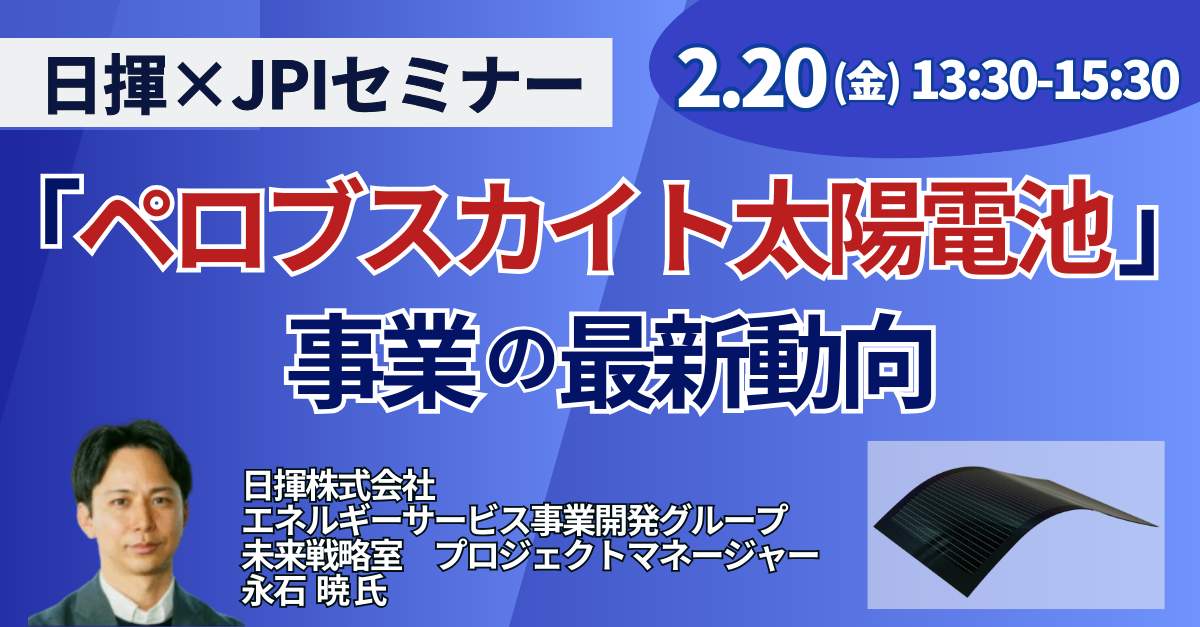 プロジェクトマネージャー 永石 暁 氏を招聘し、日揮(株)における「ペロブスカイト太陽電池」事業の最新動向と今後の更なる展開について詳説いただくセミナーを開催します。
