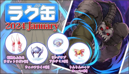 2023年12月21日(木)15:00より、「ラグ缶2024 January」の販売を開始いたします!今回のラインナップには「情熱あふれるラビットリボン[1]」、「ウォルフライエ[1]」、「リングオブアルテミス[1]」、「りんりんニャンカーベル[0]」といった新アイテム4種が登場。A賞に「R001-ベスティアカード」もラインナップ入りした、「ラグ缶2024 January」をどうぞお楽しみください。