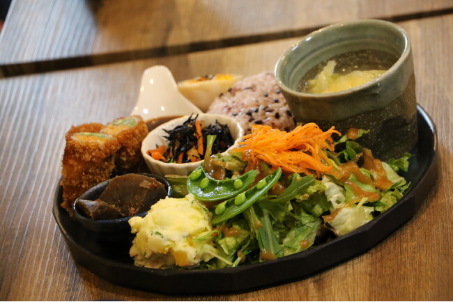 比叡山を下りた後は、2年前にオープンした「cafe POCO」で人気の週替わりプレートランチを頂きます。メインの野菜の肉巻きフライをはじめ、滋賀県産の野菜をたっぷり使ったおかずのお味は?