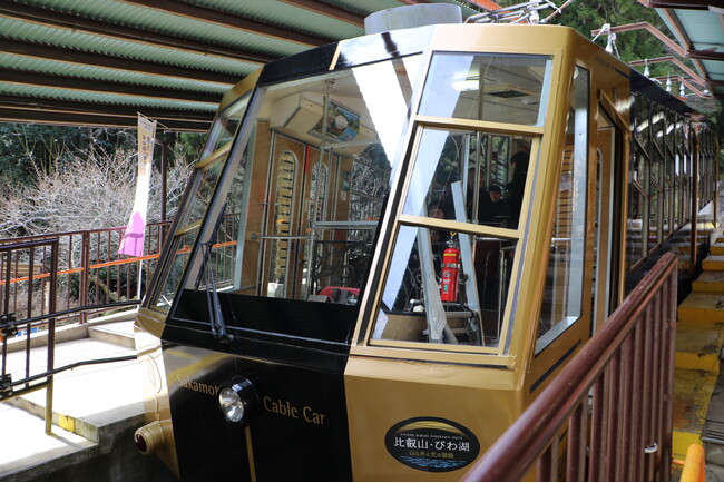 まずは、比叡山のふもとから日本最長の「坂本ケーブル」に乗車。眼下に広がる琵琶湖の絶景を楽しみます。