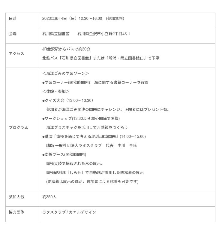 県内各地での清掃活動や県民への啓発、テレビ番組の制作など、海洋ごみ削減に向けてさまざまな事業を展開する「海ごみゼロ大作戦!in石川」。2023年度のキックオフとなるイベントを石川県立図書館で開催します。海洋ごみの現状を学ぶ展示コーナーや、海洋プラスチックを活用したアート体験、海の専門家らが出演するステージイベントなど、海を知り、海に触れて、海洋ごみを学ぶイベントとなりました。