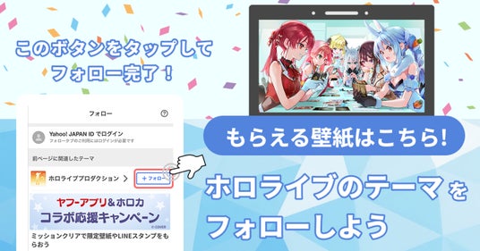Yahoo! JAPANのフォロー機能で“ホロライブプロダクション”のテーマをフォローすることでホロライブに関する新着ニュースなど最新情報を知ることができます。2万名のフォロー達成で描き下ろし壁紙の特典、さらに3万名のフォロー達成で東京・大阪・福岡にタレントを応援する屋外広告の掲出を予定です。(※詳細は特設キャンペーンサイトにて告知)