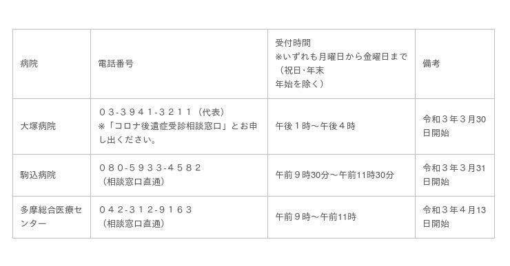 病院経営本部では、新型コロナウイルス感染症の治療や療養終了後も、味覚・嗅覚の異常や倦怠感などの症状がある方からの受診や医療に関する相談に対応する「コロナ後遺症相談窓口」を都立大塚病院及び都立駒込病院に設置しています。