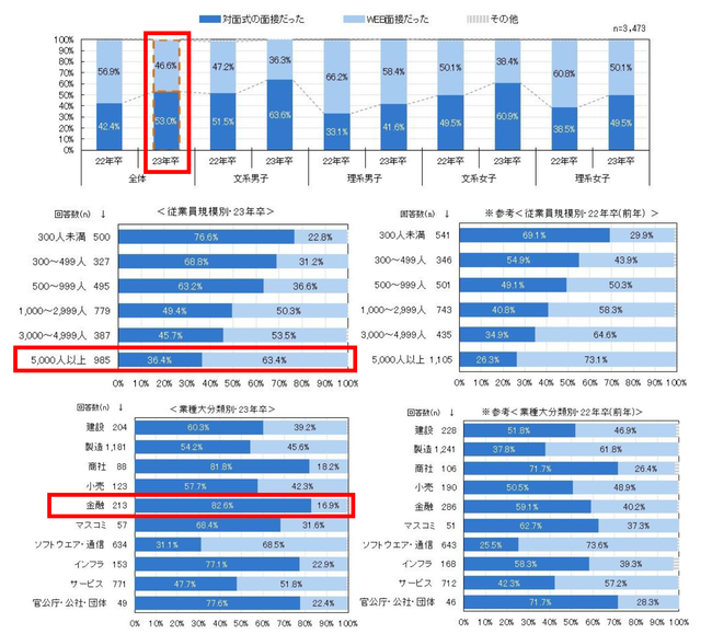 【図1】内々定先の最終面接は対面式だったか、WEB面接だったか(全体・文理男女別/従業員規模別/業界大分類別)