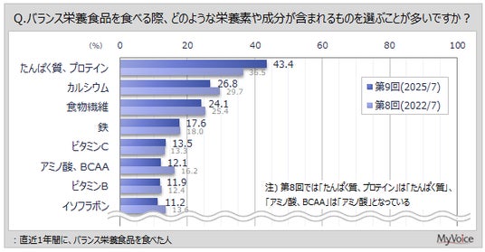 直近1年間にバランス栄養食品を利用した人が、選定時に注目する栄養素・成分は(複数回答)、「たんぱく質、プロテイン」が43.4%、「カルシウム」「食物繊維」が各20%台です。