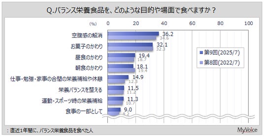 直近1年間にバランス栄養食品を利用した人に、どのような目的や場面で利用するかを聞いたところ(複数回答)、「空腹感の解消」「お菓子のかわり」が各30%台、「昼食のかわり」「朝食のかわり」が各2割弱です。