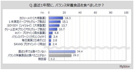 利用した銘柄は(複数回答)、「カロリーメイト」「1本満足バー」「SOYJOY」「クリーム玄米ブラン」が各10%台です。「1本満足バー」は男性10~30代や女性10・20代で比率が高く、また、バランス栄養食品を週1~2回以上利用する層では最も多くなっています。