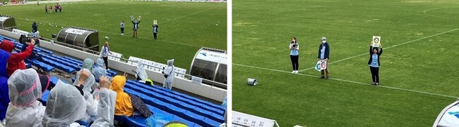 前半終了後のハーフタイムでは、観客が参加して海洋ごみについての現状を楽しく学べるクイズ大会を実施し周知啓発活動を行いました。