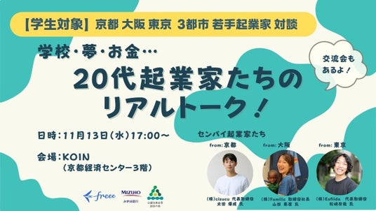 フリー株式会社(本社:東京都品川区、CEO:佐々木大輔、以下「freee」)は株式会社みずほ銀行と京都知恵産業創造の森との共催で、11月13日(水)に学生の起業支援を目的としたセミナー『\京都・大阪・東京 3都若手起業家対談/学校・夢・お金…20代起業家たちのリアルトーク!』を開催します。