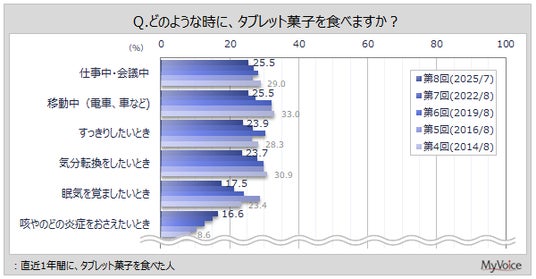 直近1年間にタブレット菓子を食べた人に、食べる場面を聞いたところ(複数回答)、「仕事中・会議中」「移動中」「すっきりしたいとき」「気分転換をしたいとき」が各20%台です。