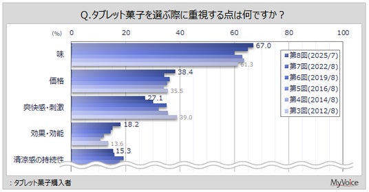 タブレット菓子選定時の重視点は(複数回答)、「味」が購入者の67.0%、「価格」が38.4%です。続く「爽快感・刺激」は27.1%、過去調査と比べて減少傾向です。