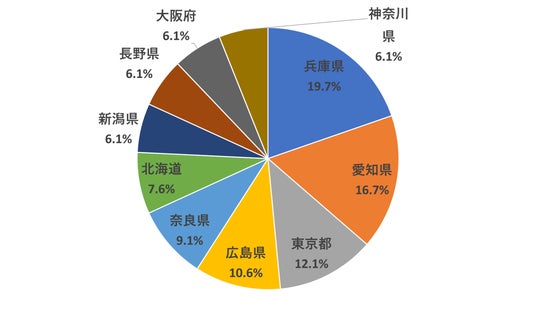 兵庫県、愛知県、東京都、広島県と大都市圏の都道府県が上位にランクインしています。
