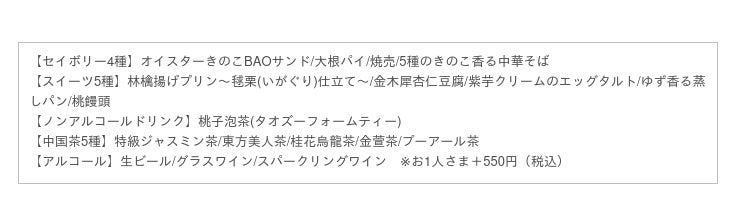 さらに“9月平日限定”で、5種のきのこ香る中華そばを除いた8品をカジュアルに頂けるよう、税込3,000円にて提供します。(中国茶飲み放題+桃子泡茶付き)