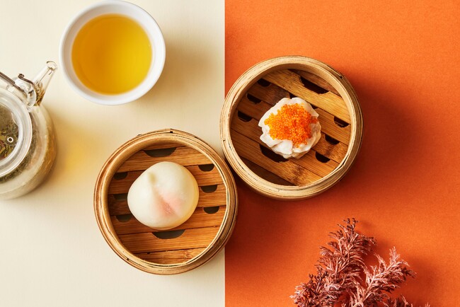 定番人気のオレンジ色のとびっこが華やかさを演出する焼売と可愛らしい蒸したての桃饅頭