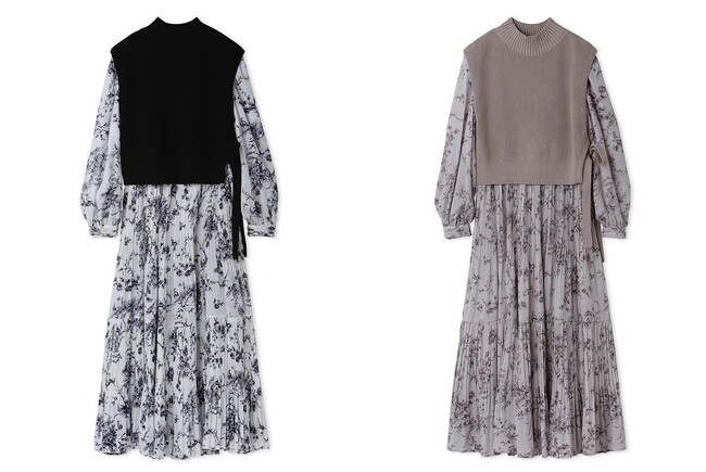 1枚でレイヤードスタイルが楽しめる、ニットベストとワンピースのセットアイテム。