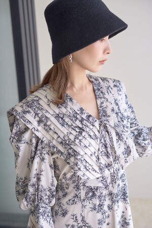 たっぷりのギャザーを効かせたネックデザインが印象的な、クラシカルムード漂うドレス。