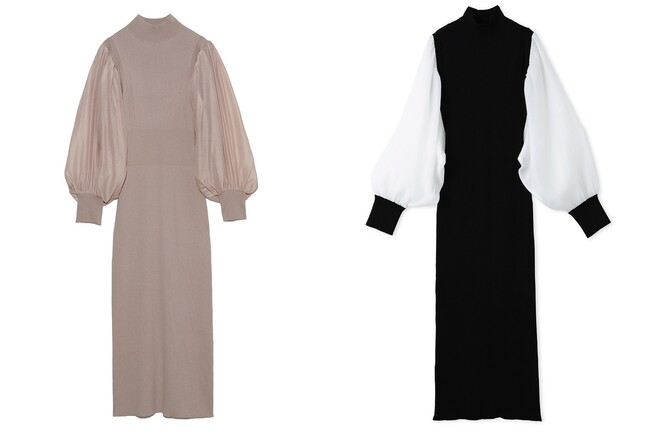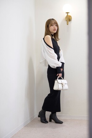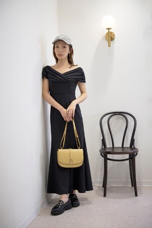 ワンピースはウエストに切り替えを入れたボディコンシャスなシルエットで女性らしさを高めました。