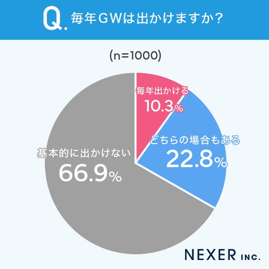 今年は飛び石連休だったことが影響したように思えますが、そもそも毎年GWはどう過ごしているのか聞いてみると、66.9%の方が「基本的に出かけない」と回答しました。