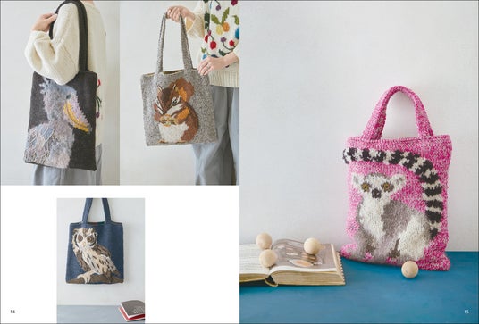 柴犬やネコ、ウサギ、インコなどの身近な動物から、オオカミやヤギ、ライオンといった大型動物まで。愛らしい動物たちの姿をバッグに編み込む、手編みの「動物バッグ」。