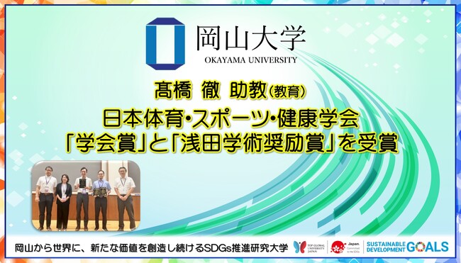 国立大学法人岡山大学(本部:岡山市北区、学長:那須保友)の学術研究院教育学域の高橋徹助教が、一般社団法人日本体育・スポーツ・健康学会より「学会賞」、ならびに「浅田学術奨励賞」を受賞しました。
