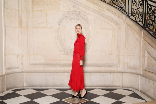 ベアトリーチェ・ボロメオは、2024年フォール コレクションからレッドのシルクドレスを纏い、パンプスを合わせました。