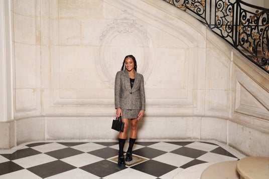 ロザムンド・パイクは、2024年フォール コレクションから刺繍があしらわれたウール素材のドレスを纏い、「レディ ディオール」バッグにソックス、シューズを合わせました。