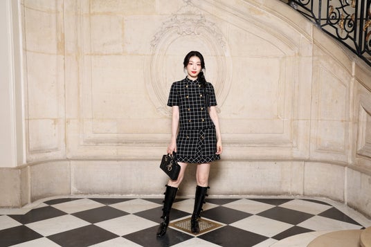 キム・ヨナは、2024-2025年ウィンター コレクションからブラックのチェック柄ウールジャケットとスカートを纏い、「レディ ディオール」バッグとシューズを合わせました。