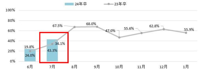 これまでにインターンシップ・ワンデー仕事体験に参加したことがある学生は、7月末時点で前年比9.5pt増の53.9%だった。7月単月でも前年比9.2pt増の43.3%となっており、24年卒学生は前年以上に積極的にインターンシップ・ワンデー仕事体験に参加している。【図1、2】