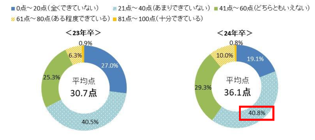 現在の就活準備レベルの自己採点は36.1点で前年よりも向上。「就職活動の方向性が固まっている」は前年比1.8pt増の34.5%【図6、7】