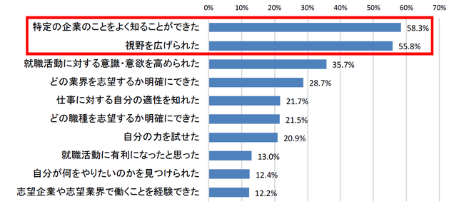 インターンシップ・ワンデー仕事体験に参加して得られたと思うことは「特定の企業のことをよく知ることができた」が58.3%で最多、次いで「視野を広げられた」が55.8%で半数を超えた。インターンシップ参加が「志望企業の絞り込み」と「志望対象の拡大」の両方に役立っていることがわかる。また、自由回答では「他大学の人と交流するなかで自分を客観視することができた」や「社会人を疑似体験できた」などの意見がみられた。【図3、4】