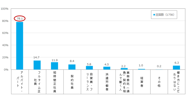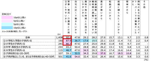 現在アルバイトで働く主婦が今後希望する働き方は、「アルバイト・パート」が78.1%と最も多かった。希望する理由は「家事・育児・介護等との両立がしやすいから」が60.4%と最も多く、属性別でみると、「小学校入学前の子供がいる」が87.9%、「小学生の子供がいる」が80.7%でそれぞれ全体比10pt以上高い結果となった。【図1、2】
