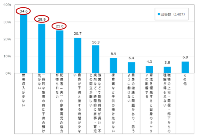 子育てと仕事の両立について困っていることでは「世帯収入が少ない(34.6%)」、次いで「一時的な急用の時に子供の預け先がない(28.9%)」、「配偶者(夫)の家事育児の協力が得られない(25.0%)」という結果だった。【図3】