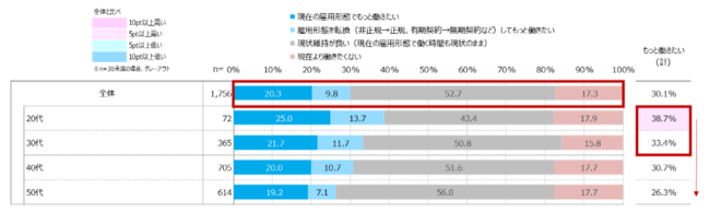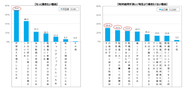 配偶者が育児休暇を取得した際の、主婦の就業意向は「現状維持が良い(現在の雇用形態で働く時間も現状のまま)」が52.7%と最も高く、次いで「現在の雇用形態でもっと働きたい」が20.3%となった。さらに、「もっと働きたい」と回答した人を年代別でみると、20代が38.7%、次いで30代が33.4%と、若年層ほど高いことがわかった。また、「もっと働きたい」理由は「世帯収入を増やしたいため」が70.0%と最も高くなった。【図4】
