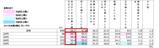 リスキリング(自身のスキルを見直すため新しいことを学ぶこと)について「必要性を感じている」人は51.0%と半数を超えたが、実際に「取り組んでいる」のは15.3%にとどまった。リスキリングが必要と思う理由は「自分ができる仕事の幅を広げたいため」が54.7%と最も高く、次いで「収入を増やしたいため」が47.8%となった。「自分ができる仕事の幅を広げたいため」が全年代で最も多かったが、年代別で見ると20代が62.7%と最多で、次いで30代が59.9%と、若年層ほど自分の可能性や視野を広げるためにリスキリングが必要と考えていることがうかがえる。【図6、7】