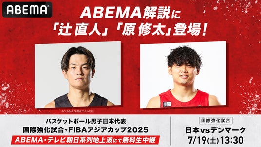 新しい未来のテレビ「ABEMA(アベマ)」は、2025年7月19日(土)午後1時より無料生中継する、アジアカップ直前の強化試合『日本vsデンマーク』にて、元日本代表で現役Bリーガー・辻直人選手(群馬クレインサンダーズ所属)、原修太選手(千葉ジェッツ所属)の2名が解説者として出演することをお知らせいたします。