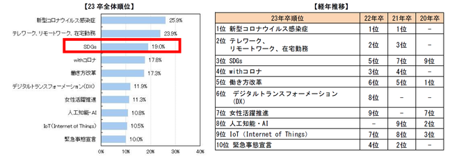 就職活動に影響したニュースワードは1位「新型コロナ」、2位「テレワーク」、3位「SDGs」。「SDGs」は3年前(9位)から年々順位を上げ初のベスト3【図1、2】