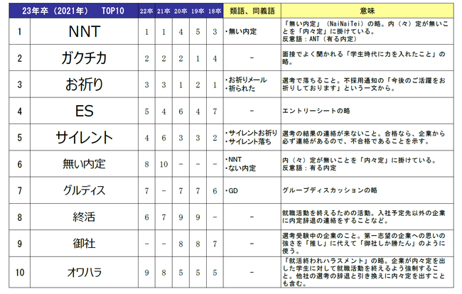 就職活動に影響したニュースワードは「新型コロナ」「テレワーク」「SDGs」。流行った就活用語の1位は3年連続で「NNT」(無い内定の略語)