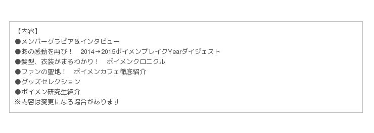 2010年に東海地方で結成され、今や名古屋のみならず全国各地で活躍するご当地イケメンユニットのボイメンこと『BOYS AND MEN』。彼らのデビューから現在に至る成長と歴史をつづった貴重な記念本が発売決定! 小林豊、水野勝などをはじめとするメンバーの撮り下ろしグラビアはもちろん、彼らの聖地・名古屋のオススメグルメやスポットなど、ファンならずとも絶対知りたい情報をたっぷり収録! 未公開秘蔵動画満載のDVDとA3ポスターも付いて、ボイメンファンのバイブルになること間違いなしの一冊です!