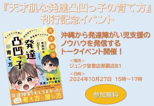 今年8月に発売した書籍『天才肌な発達凸凹っ子の育て方』の刊行を記念し、ジュンク堂書店那覇店にてトークイベントを開催。登壇するのは『天才肌な発達凸凹っ子の育て方』の著者で、放課後等デイサービス「ドーユーラボ」の設立者である南雲玲生氏と、「ドーユーラボ」代表中園佑太氏です。