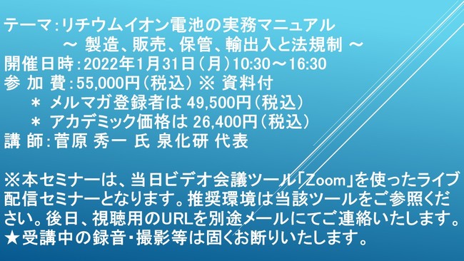 先端技術情報や市場情報を提供している(株)シーエムシー・リサーチ(千代田区神田錦町: https://cmcre.com/ )では、 各種材料・化学品などの市場動向・技術動向のセミナーや書籍発行を行っておりますが、 このたび「リチウムイオン電池の実務マニュアル ~ 製造、販売、保管、輸出入と法規制 ~」と題するセミナーを、 講師に菅原 秀一 氏 泉化研 代表)をお迎えし、2022年1月31日(月)10:30より、 ZOOMを利用したライブ配信で開催いたします。 受講料は、 一般:55,000円(税込)、 弊社メルマガ会員:49,500円(税込)、 アカデミック価格は26,400円(税込)となっております(資料付)。