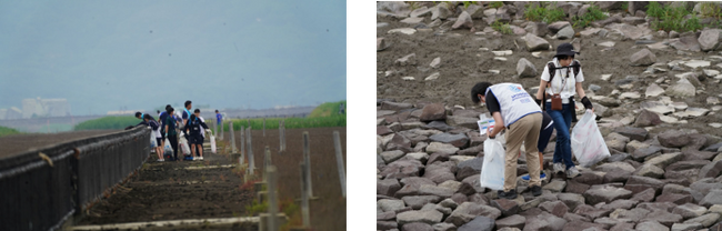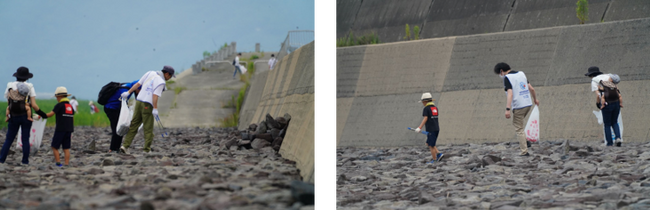 今大会の会場となった東与賀海岸は、有明海湾奥部に広がる泥の干潟です。そのため泥が堆積している場所も多く、参加者の服や靴などを泥だらけにしながら一生懸命ごみを拾う姿が印象的でした。岩場の隙間に落ちているごみや茂みの中に隠れているごみを見つけ出し、参加チーム全員で総量68.285kgと多くのごみを拾い集めました。