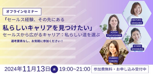 フリー株式会社(本社:東京都品川区、CEO:佐々木大輔、以下「freee」)は、営業経験者向けキャリアセミナー「セールスから広がるキャリア:私らしい道を選ぶ」を11月13日(水)freee本社にて開催します。