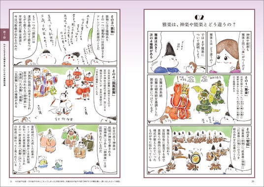 「全部同じ曲に聴こえてしまう」、「どこに注目すれば楽しめる?」とか「初心者におすすめの演目や鑑賞マナーがあれば教えて」という声に応えて、本書は雅楽初めてさんにもわかりやすいように、ポイントのあれこれをマンガで紹介しました。