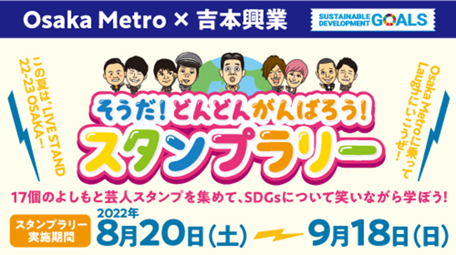 この度、吉本興業株式会社(以下、吉本興業)はOsaka Metroとタイアップし、SDGsを遊びながら学べるスタンプラリー「そうだ!どんどんがんばろう!スタンプラリー」を2022年8月20日(土)から9月18日(日)までの期間開催します。