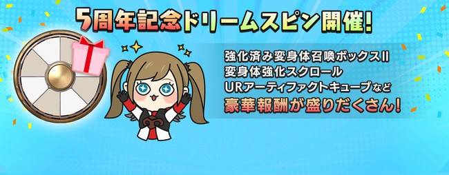 本アップデートでは、5周年を記念して「+4~8強化済み変身体ボックス」や「変身体強化スクロール」など豪華報酬が獲得できるドリームスピンを開催いたします。