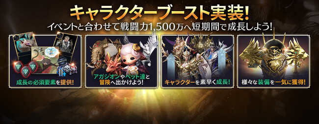 キャラクターを短期間で高成長させることができる新機能「キャラクターブースト」を追加いたしました。ZR装備や、エンチャントボード、アーティファクト、アガシオン、騎乗ペットなどを大量に入手することができ、さらに5周年記念で開催するイベントの報酬を合わせることで、キャラクターをレベル500、戦闘力1500万へ素早く成長をさせることができます。