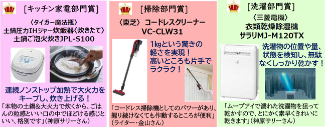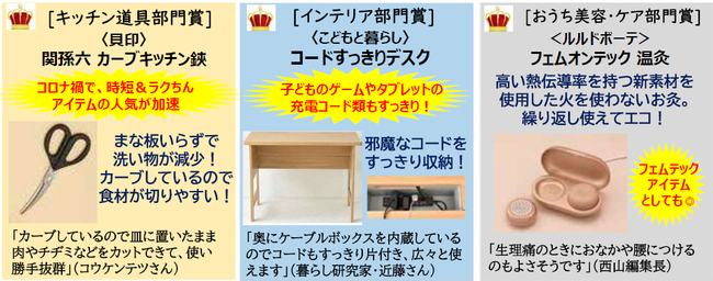 同賞は、暮らしをより豊かにしてくれる価値のある日用品を知ってもらいたいという思いで実施しており、従来のヒット商品ランキングにはない、『リンネル』独自の目線で選定しています。今年は、料理研究家のコウケンテツさんや家電ライフプロデューサーの神原サリーさんなどの目利きの方々と『リンネル』編集部が、各自のおすすめ商品を推薦し、「キッチン道具」「キッチン家電」「掃除」「洗濯」「インテリア」「おうち美容・ケア」の6部門で大賞アイテムを決定。昨年に引き続き、コロナ禍で増えた料理や掃除などの家事をラクにする時短アイテムが今年も人気となりました。また、大賞だけではなく快適にリモートワークができるグッズや“家飲み”におすすめのアイテム、気持ちが上がる食器など、おうち時間をより豊かに楽しくする全117アイテムを紹介しています。