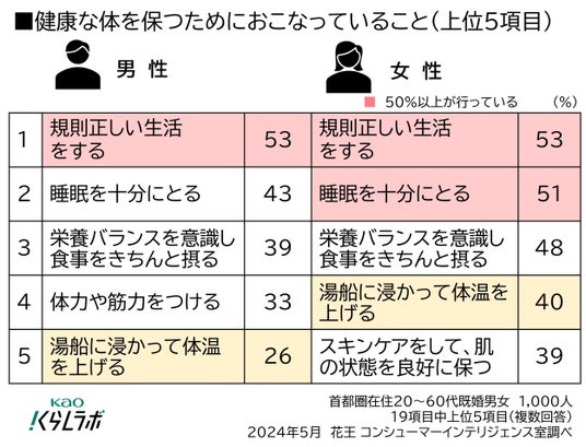 新型コロナウイルスの流行の経験もあり、免疫を高めることへの関心からか、入浴で体温を上げることが意識されるようになりました。花王の調査によると、健康な体を保つためにおこなっていることとして、約半数が「規則正しい生活をする」や「睡眠を十分にとる」を挙げ、次いで「栄養バランスを意識した食事」、「湯船につかって体温を上げる」、「体力や筋力をつける」が続きます。