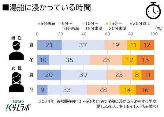 しかし、多くの人は夏になるとシャワー中心の入浴スタイルに移行し、週に3回以上湯船につかる人は冬に比べて減少します。特に男性は、女性に比べ夏も冬も湯船につかる入浴の頻度が低い傾向にあります。また、夏は湯船につかる時間が10分未満の人が約6割に達し、男女ともに冬に比べ短時間になっています。